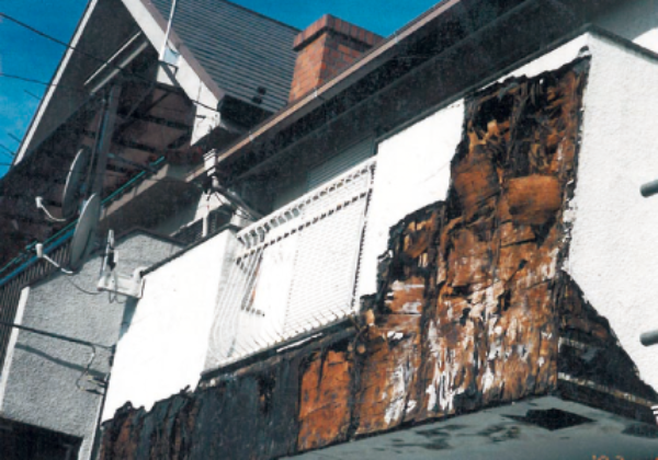 防水の切れたモルタル壁は砂場に水をかけるように水を吸収し、内部の柱